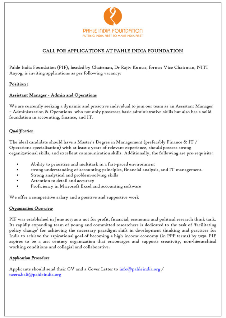 Pahlé India Foundation (PIF), chaired by Dr. Rajiv Kumar (Former Vice Chairman, NITI Aayog), is inviting applications for the role of Senior Manager/Manager, Finance.