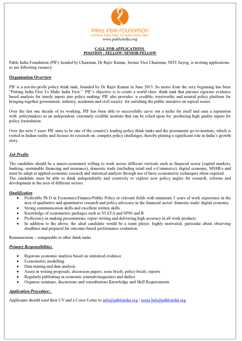 Pahle India Foundation (PIF) headed by Chairman Dr Rajiv Kumar, former Vice Chairman, NITI Aayog is inviting applications for “Senior Research Associate”. She/he will be responsible for conducting economic esearch, drafting policy papers, engaging with stakeholders, and contributing to the foundation’s thought leadership in economic policy. This role requires strong analytical skills, independent research capabilities, and a deep understanding of India’s economic and policy landscape.