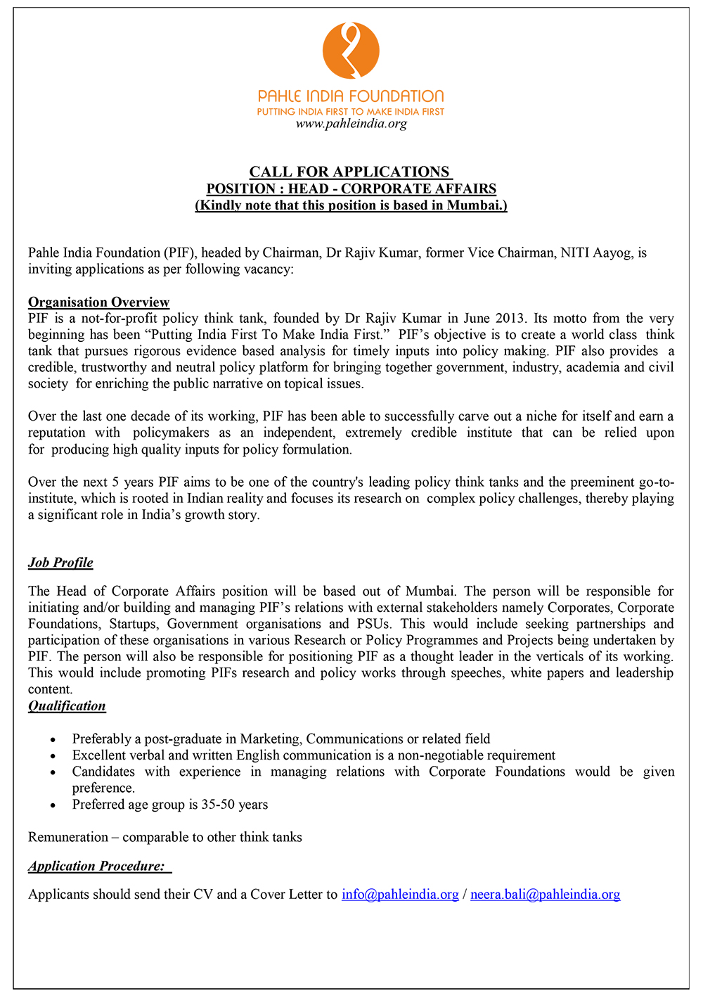 Pahle India Foundation (PIF), headed by Chairperson, Dr Rajiv Kumar, former Vice Chairman, NITI Aayog, is inviting applications as per following vacancies.
