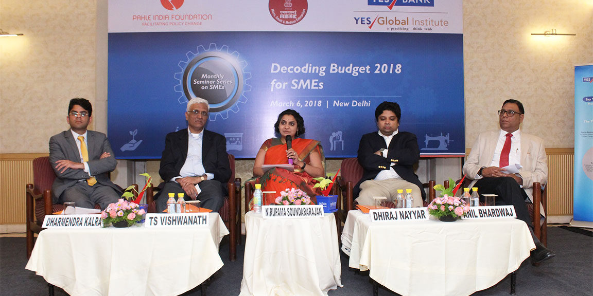 The seventh seminar of the “PIF-YGI Monthly Seminar Series on MSMEs” was held in New Delhi on the 6th March 2018. Ms Gunja Kapoor, Associate Fellow, Pahle India Foundation made the introductory remark at the session. The panellists at the seminar included Shri Dhiraj Nayyar, Head- Economics, Finance and Commerce, NITI Aayog, Government of India, Shri TS Vishwanath, Principal Adviser, APJ-SLG Law Offices, Shri Anil Bhardwaj, Secretary General, FISME, Shri Dharmendra Kalra, Head- Small Business Banking North and East, Yes Bank Ltd The session was moderated by Ms. Nirupama Soundararajan, Senior Fellow, Pahle India Foundation.