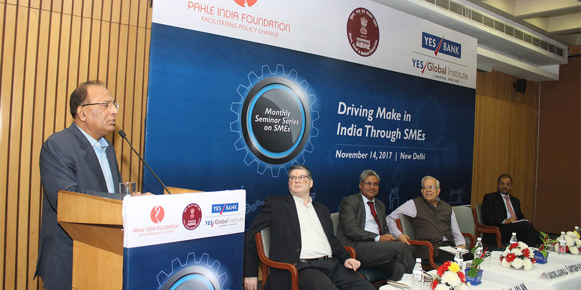The fifth seminar of the monthly “PIF-YGI Monthly Seminar Series on MSMEs” was held in New Delhi on the 14th November 2017. Ms. Nirupama Soundararajan, Senior Fellow, Pahle India Foundation made the introductory remark at the session. The session was moderated by Dr. Ramgopal Agarwala, Pahle India Foundation while the panellist included Shri K.K. Jalan, Former Secretary, Ministry of MSME, Shri Dilip Chenoy, Former MD & CEO, NSDC and Shri Sumit Gupta, Group President and National Head, Business and Rural Banking, YES BANK.
